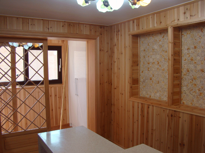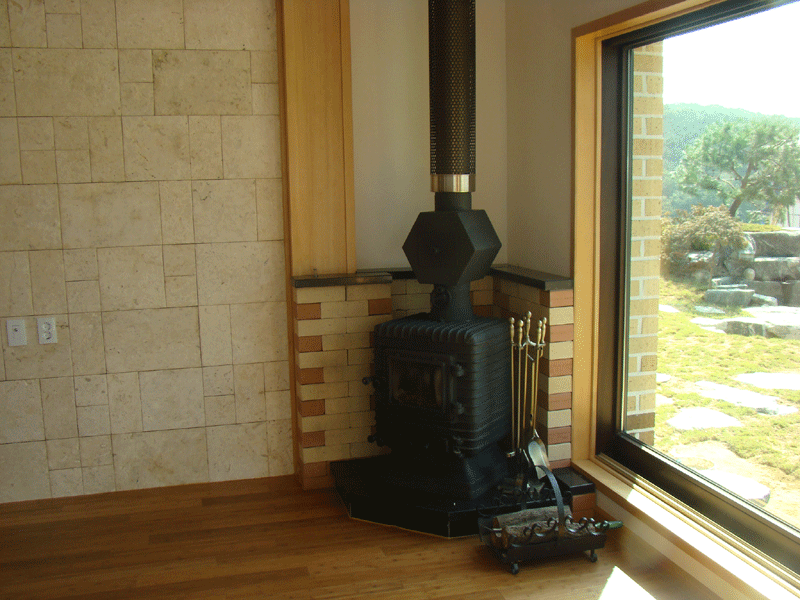 높은 거실천정과 벽난로가 있는 전원 주택 거실에 대나무 마루와 아트월 그리고 자연을 닮은 조명으로 내부 인테리어를 마무리하고 방분은 예술가의 작품과 같은 원목도어를 사용하였습니다.