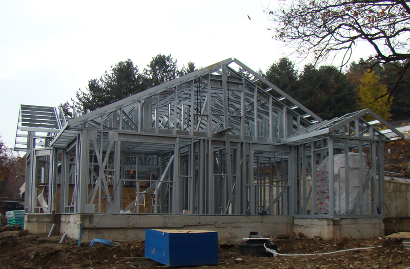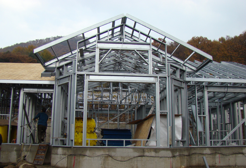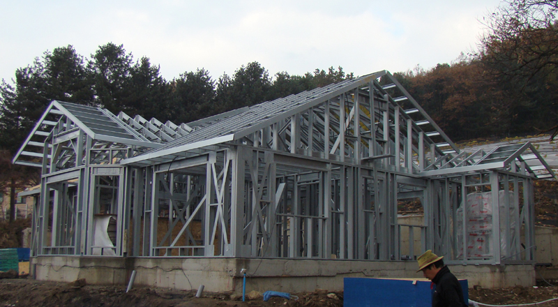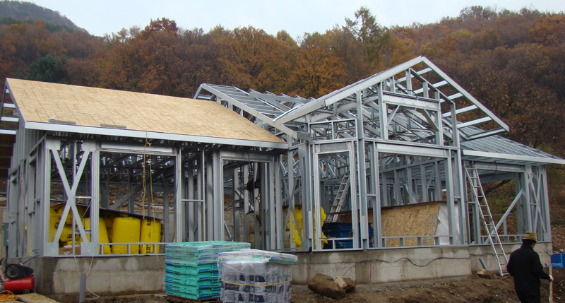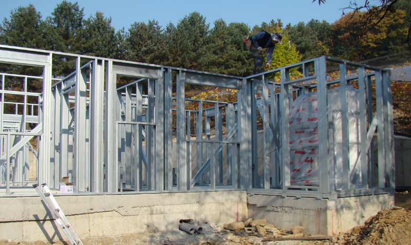 지진과 태풍으로 부터 안전한 주택 스틸하우스 벽체를 전문 기술자들이 설치 하고 있습니다
