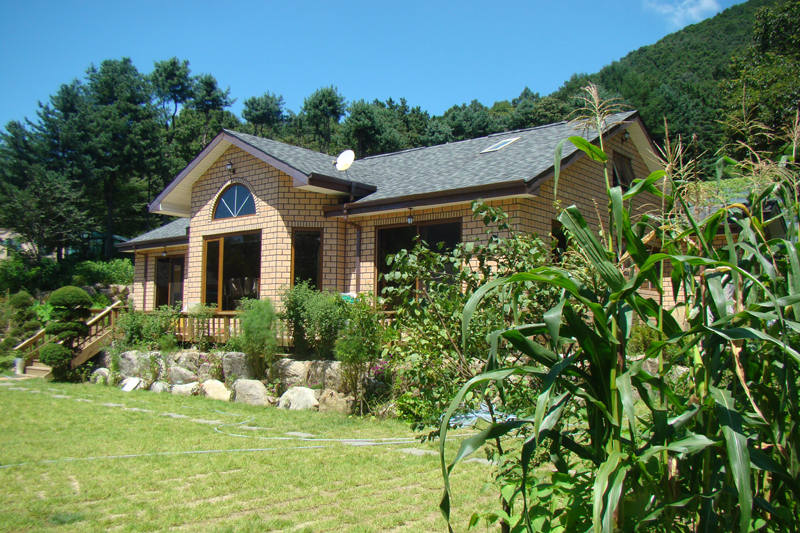 완공후 여름에 다시찾은 주택/ 덧밭에는 옥수수와 토마도 상추등 먹거리가 잔득 심어져 있습니다.