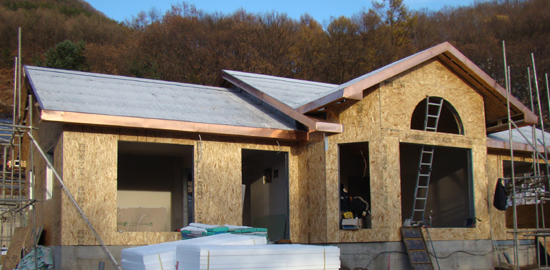 지붕과 벽에 osb합판을 붙이고 지붕에는 방수 쉬트를 붙여 지붕방수를 마무리 하였습니다.
