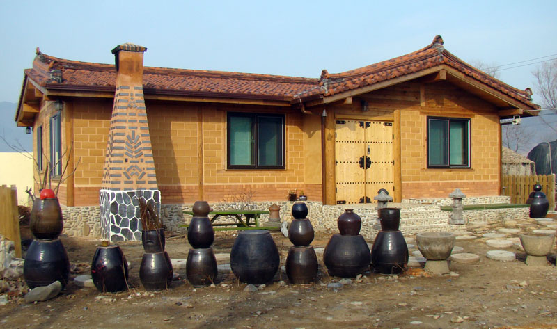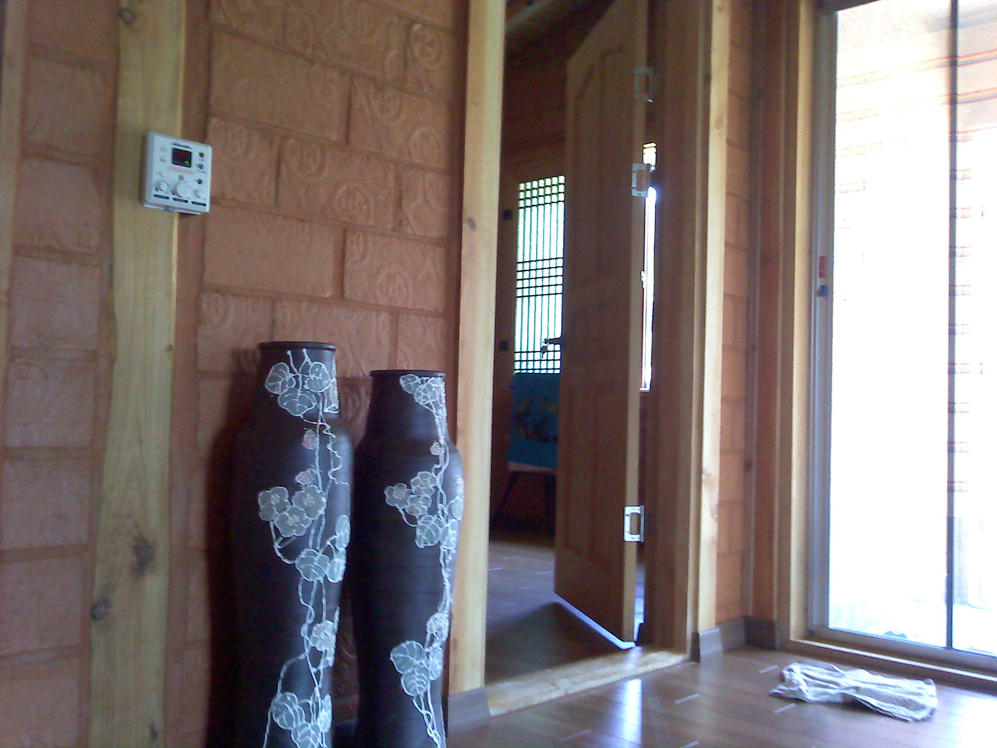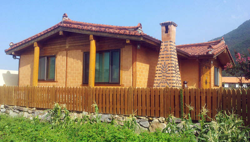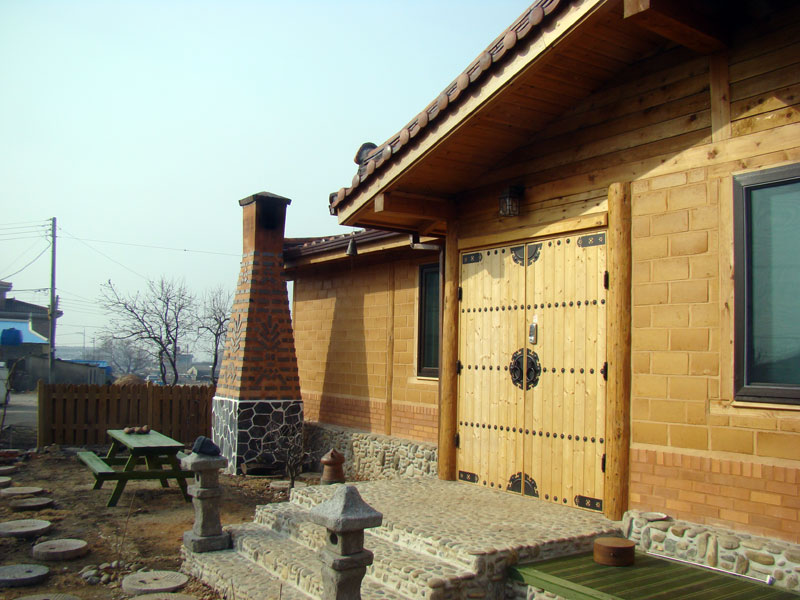 원목과 황토벽돌로 짓고, 전통 한옥기와 보다는 밝아 보이는 분위기에 찜질방을 만들어 몸이 피곤할때 푹 쉬게 하고 싶어 하였고,