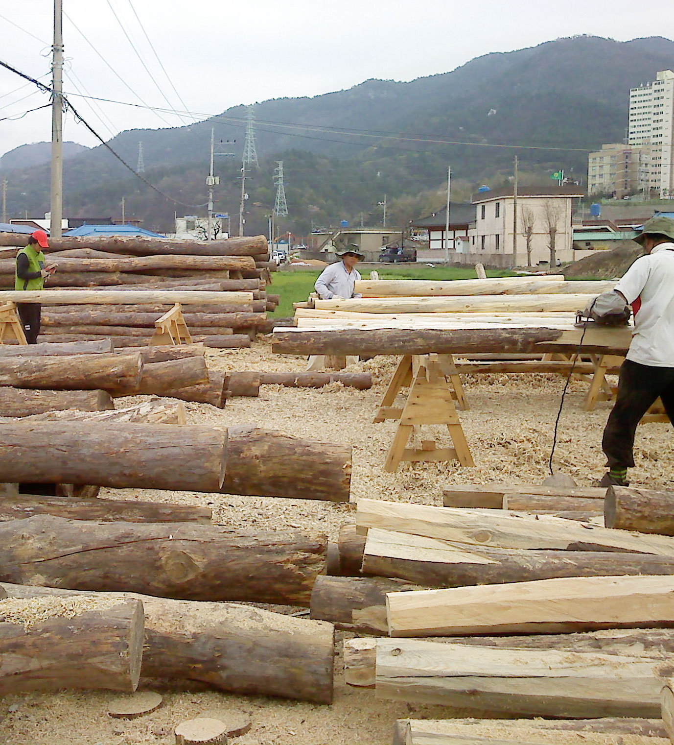목재소에서 소나무를 골라 현장에서 기둥이될 나무들을 수작업으로 깍고 있습니다.